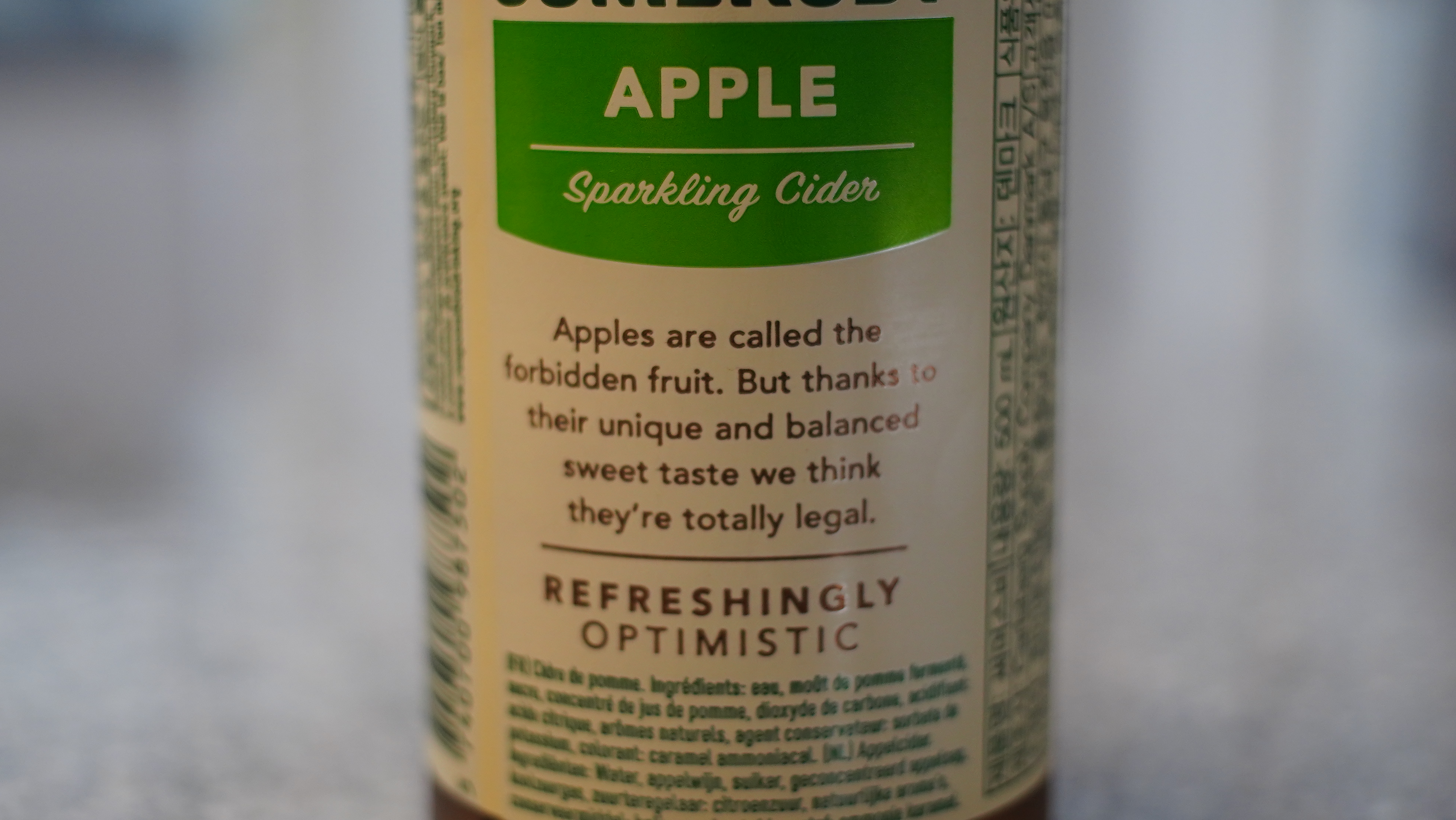 Apples are called the forbidden fruit. But thanks to their unique and balanced sweet taste we think they're totally legal. REFRESHINGLY OPTIMISTIC(리프레싱리 옵티미스틱). 사과는 금단의 과일이라고 불린다. 하지만 사과의 독특하고 균형잡힌 달콤한 맛 덕분에 우리는 전적으로 사과는 합법적이라고 생각한다.