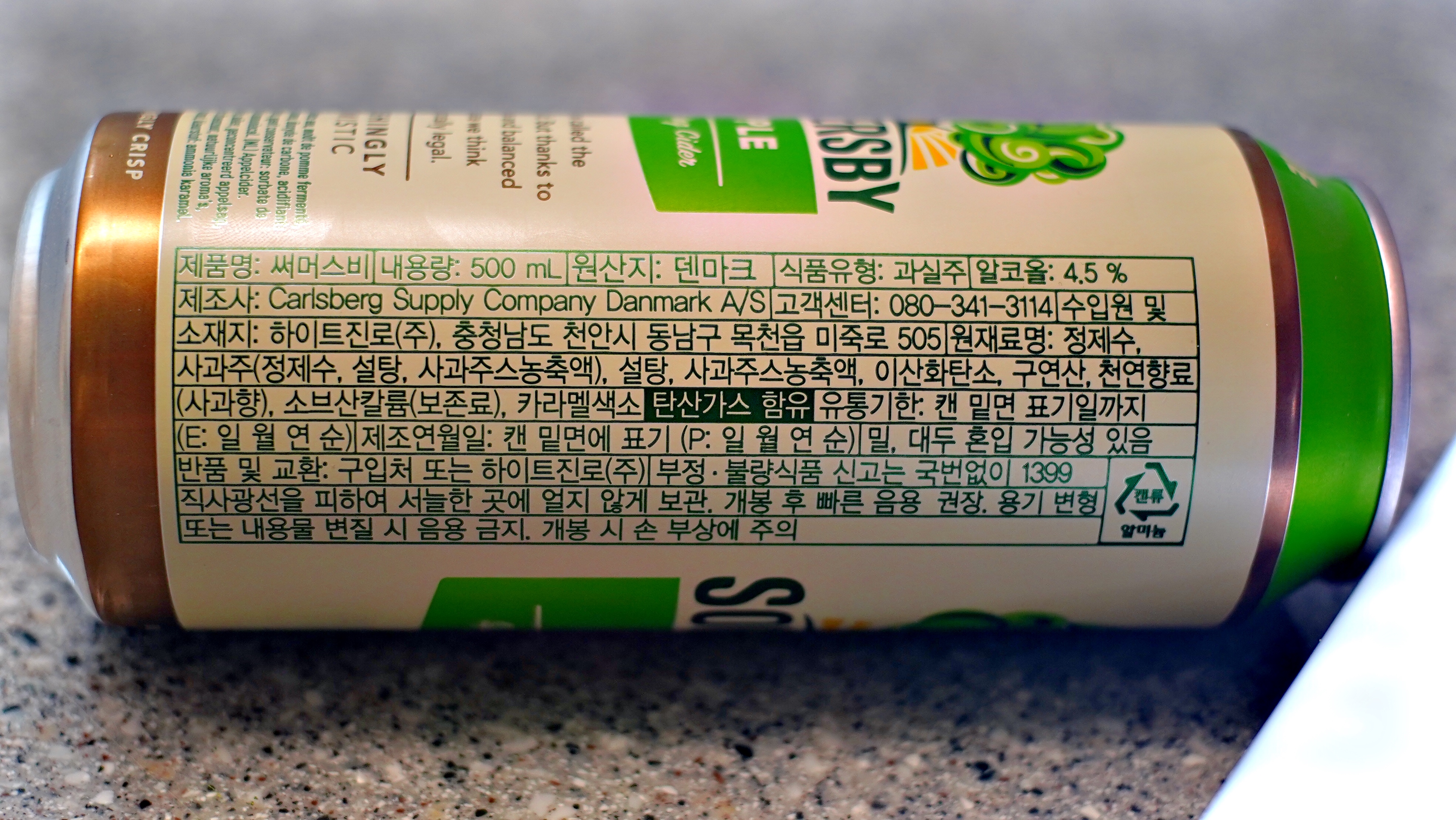 제품명 : 써머스비 내용량 : 500mL 원산지 : 덴마크 식품유형 : 과실주 알코올 : 4.5% 제조사 : Carlsberg Supply Company Danmark A/S 수입원 및 소재지 : 하이트진로(주)